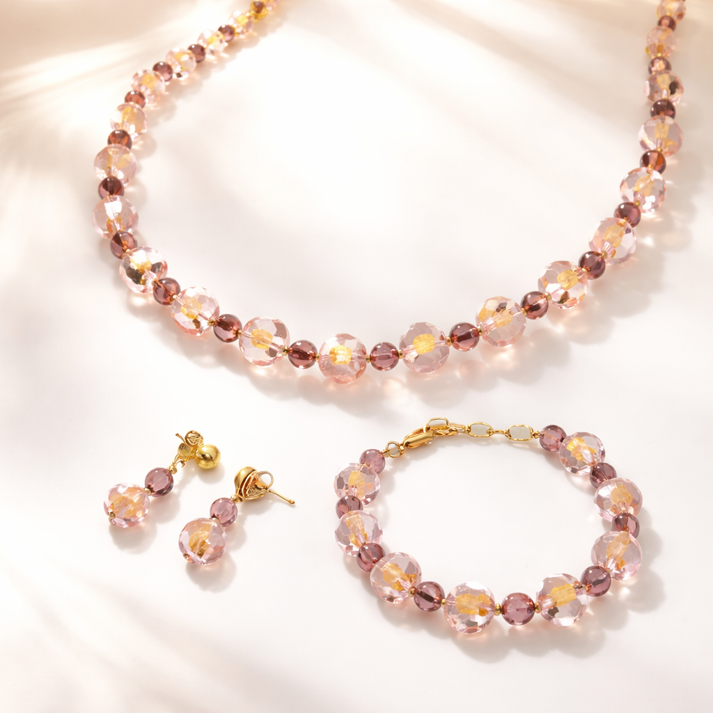Pink Gossamer Necklace Set subtly illuminates any look you choose for the day. The shimmering cloud of the soft pink echo through the necklace, bracelet and earrings. Float away with this breezy, soft pink shade shining with the nugget of gold in each Murano glass bead. Lampworked beads with gold infused in the clear pink glass are created over a flame, each one individually by hand. This traditional process creates a signature look of Murano glass jewelry often imitated, never duplicated. We named this “gossamer” because it is so light and airy, beautiful. The necklace is 16″ to 19″ long, bracelet is 7″ to 8″ long, earrings are 1 1/4″ long. Enjoy the uniquely fine, soft look that whispers your elegance and appreciation of European design; a set to be enjoyed for decades. Clasps are hypo-allergenic, nickel-free.
